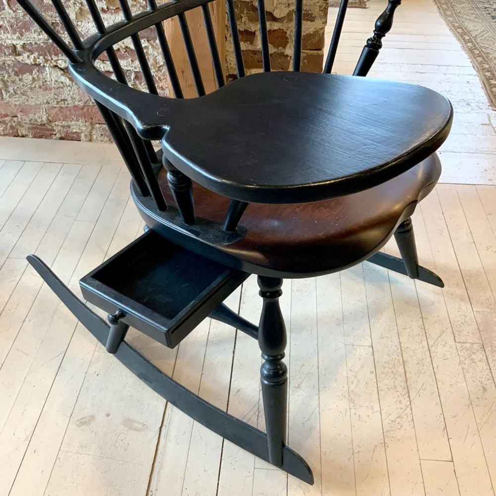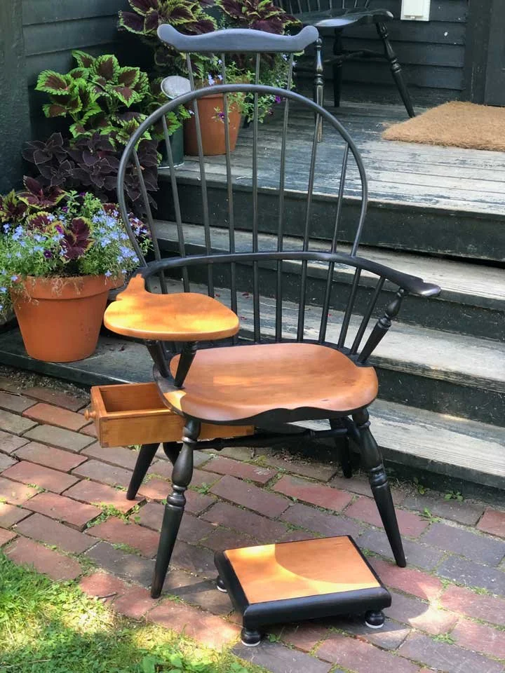 Sackback Writing Armchair with drawer & comb – Hard maple seat painted black crackled with cranberry wear
