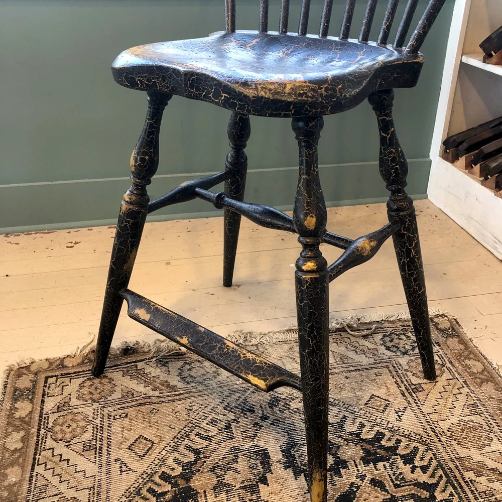 Pitch Black over Tavern Green milk paint, Chestnut saddle, gold on ring turnings. Tiger Maple seat, all other parts made from ash. 2″ Extendend legs. Crackle finsh with medium highlight and light distress. Seat height 20″